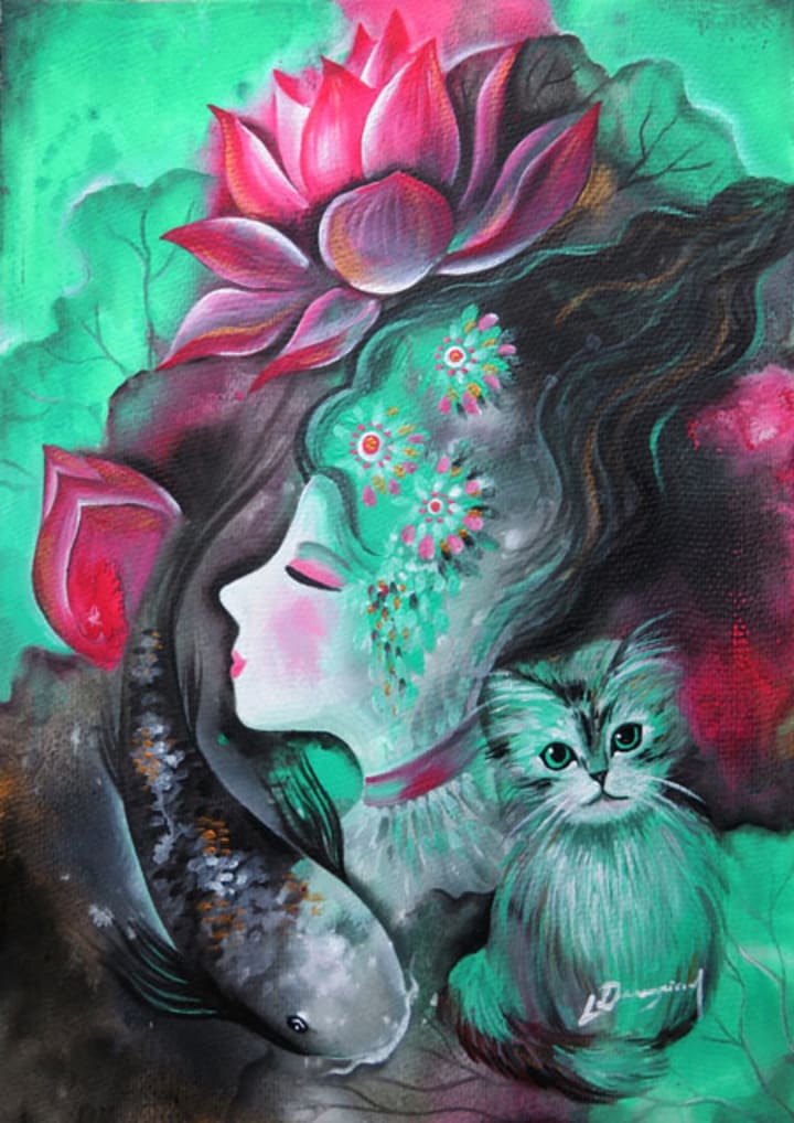 Then the Golden Flower Goddess gently picked us up. She once again kissed my elder sister and me, and then gently put us into the cloud in the old well. I felt like I was floating and falling slowly... I did not know how long I had been floating and falling. I only felt the kiss of the Golden Flowers Goddess, it was so warm and happy. I also felt my sister was beside me. Everything was like a dream. At last, we seemed to stop. It was dark and warm. I knew that we were in the belly of our mother cat. This should be our home. "Ah! This mother cat gave birth to six kittens!" I heard someone shouting right at that moment.